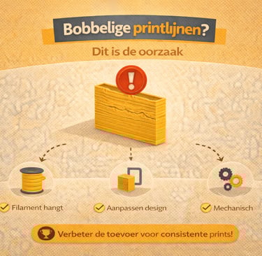 Bobbelige printlijnen ontstaan wanneer de toevoer van filament niet constant is. Dit kan komen door weerstand, verstoppingen, verkeerde instellingen of mechanische problemen.