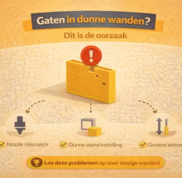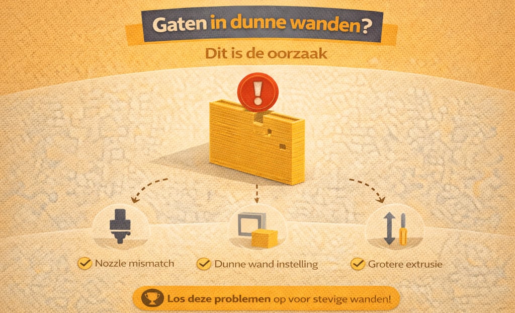 Gaten in dunne wanden ontstaan wanneer de printer de ruimte niet goed kan vullen. Dit komt meestal door een mismatch tussen wanddikte en extrusiebreedte.