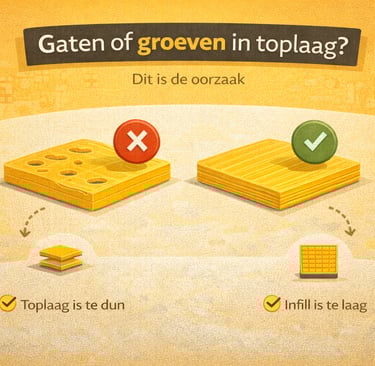 Zie je gaten of groeven in de toplaag van je 3D print? Ontdek de oorzaken en leer hoe je dit probleem oplost voor een strak resultaat.