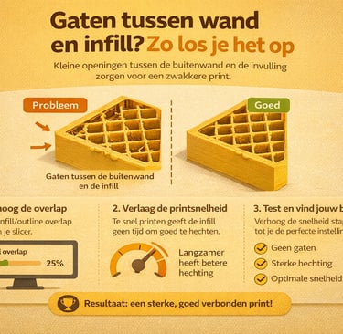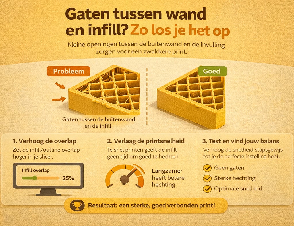 Zie je gaten tussen de buitenwand en infill van je 3D print? Ontdek de oorzaken en leer hoe je dit probleem oplost voor sterke prints.