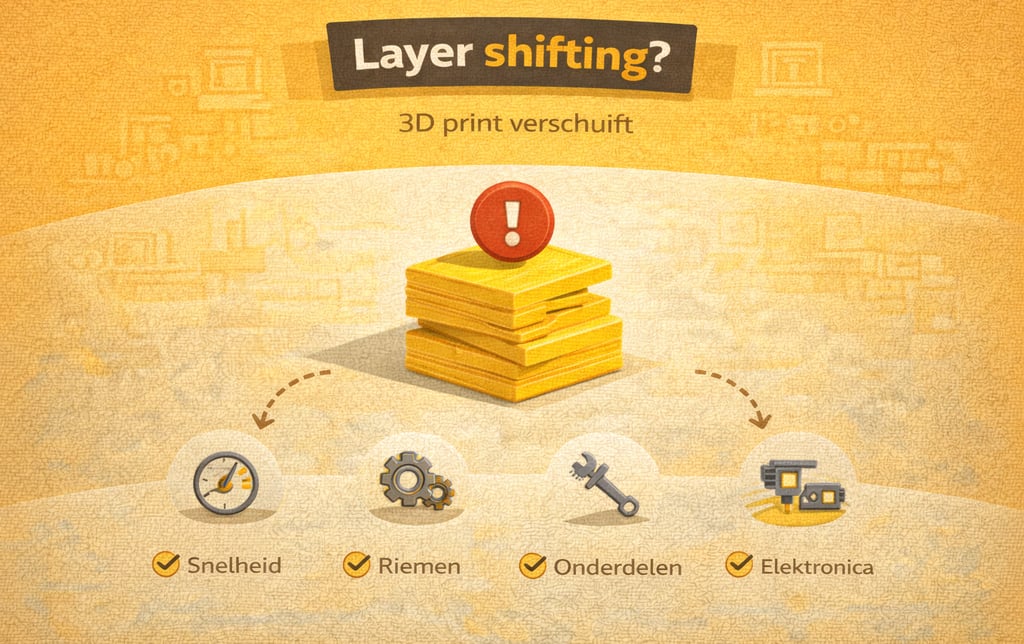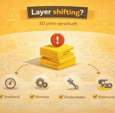 Layer shifting ontstaat wanneer je printer zijn positie verliest tijdens het printen. Dit komt meestal door te hoge snelheid, verkeerd afgestelde riemen of mechanische problemen.