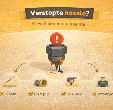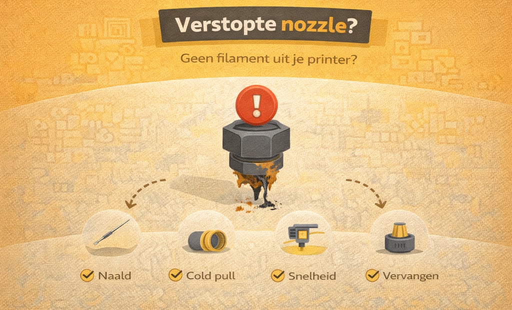 Beweegt je printer wel, maar komt er geen filament uit? Dan heb je bijna zeker een verstopte nozzle. Dit is een veelvoorkomend probleem en gelukkig meestal goed op te lossen.
